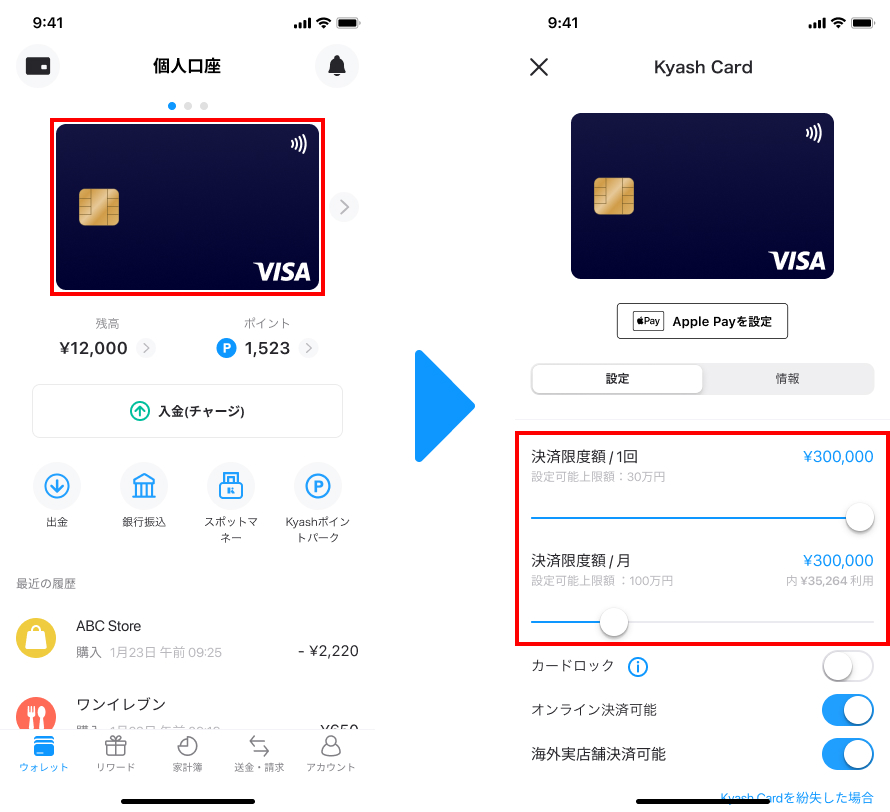 Kyash CardおよびKyash Card Virtual*において設定できます。
