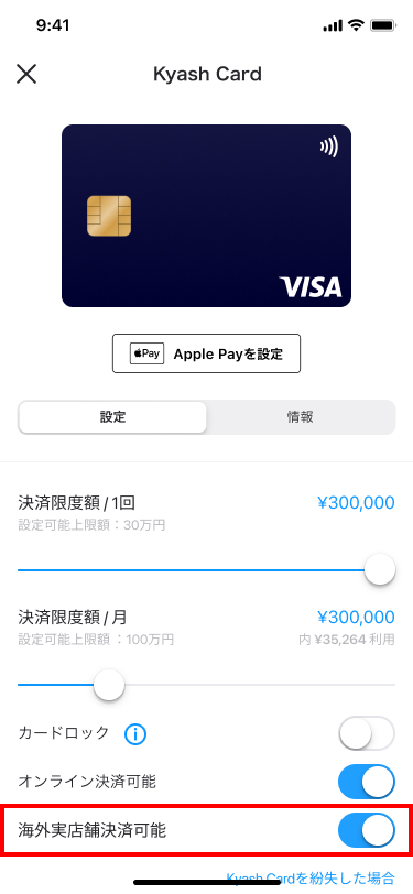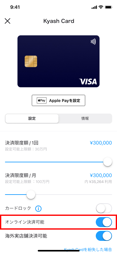 Kyash Visaカードはアプリからカードの設定を変更することができます。