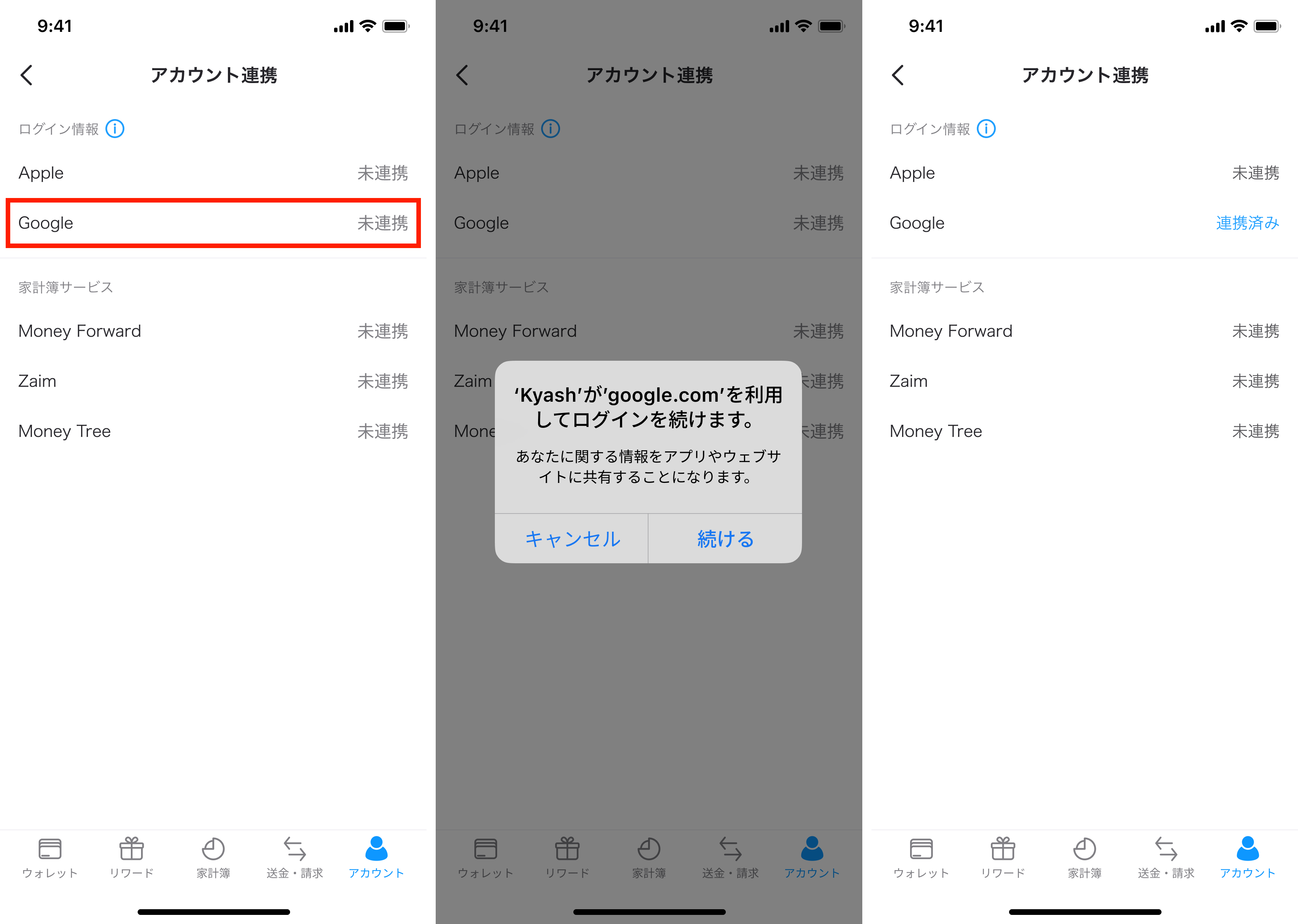 Kyashアプリを開き アカウント > アカウント連携 の順にタップします。